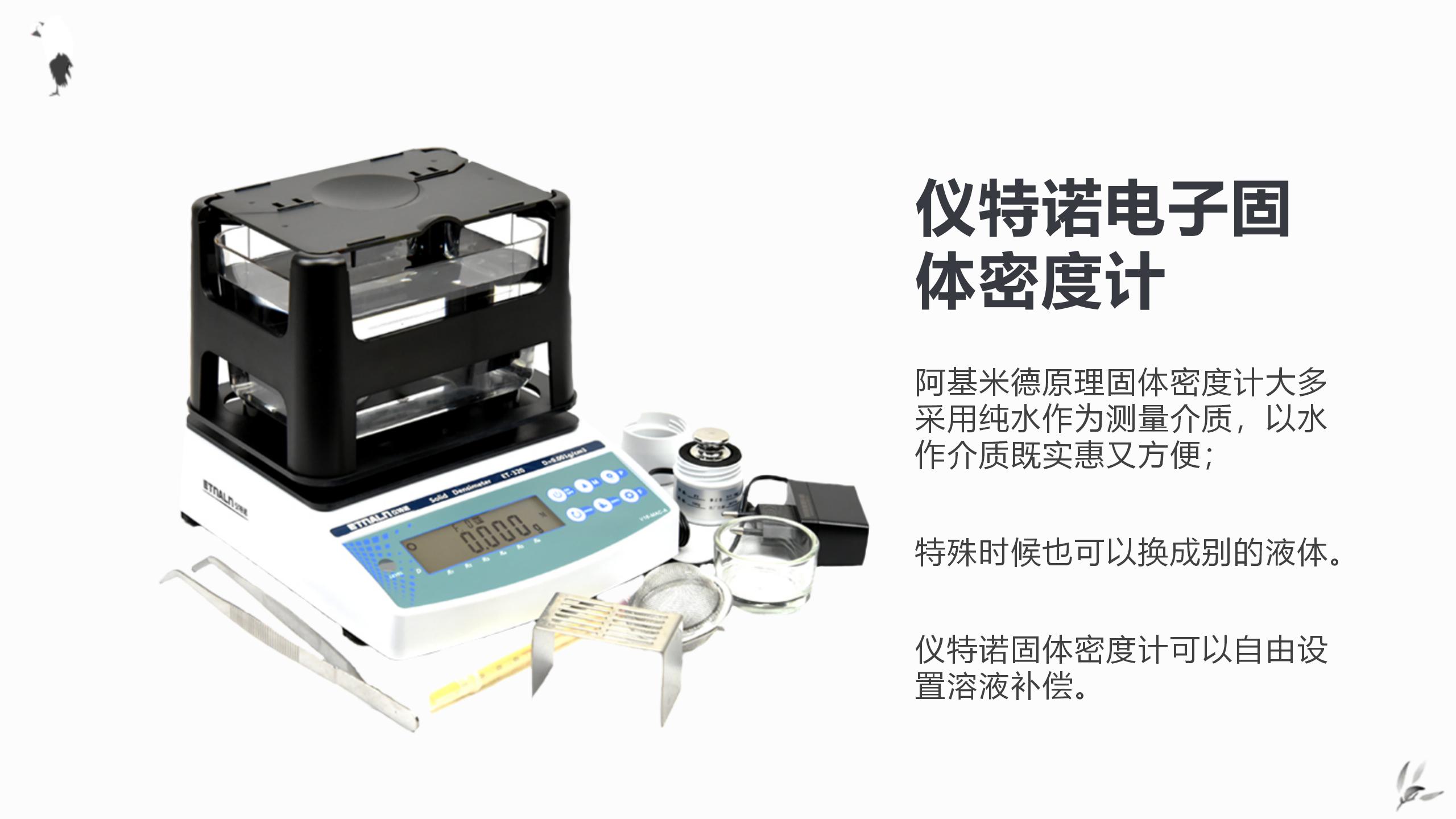 阿基米德原理固體密度計(jì)大多采用純水作為測量介質(zhì),以水作介質(zhì)既實(shí)惠又方便;特殊時候也可以換成別的液體。儀特諾固體密度計(jì)可以自由設(shè)置溶液補(bǔ)償。