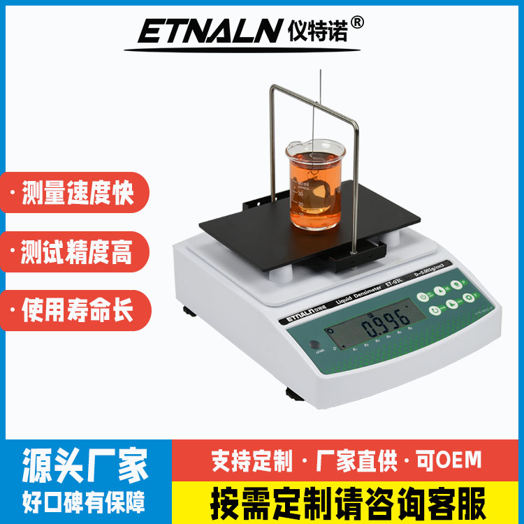 這時候我們就推薦了ET-03L這款臺式密度計:最小取樣量20ml,少量樣品也能測;比手持式能測量的液體種類更高,揮發(fā)性、粘稠性的液體都可以測試;性價比更高,長期用著更劃算。