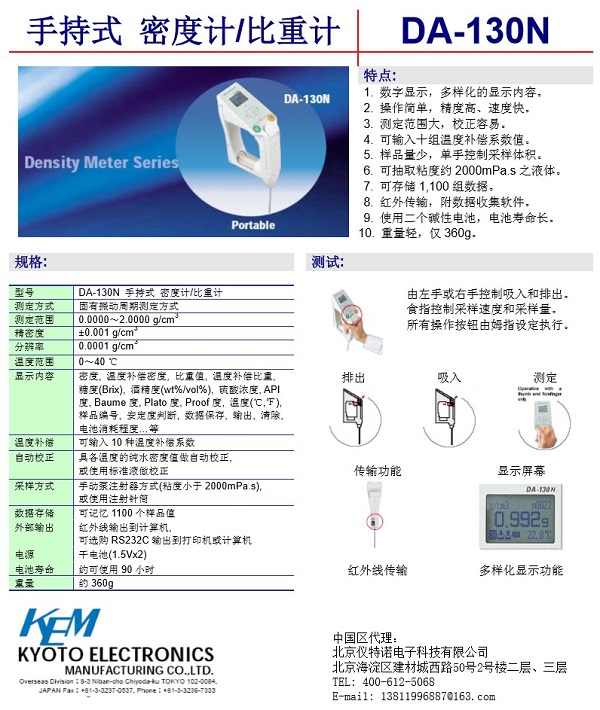 手持便攜式液體密度計(jì)DA-130N是日本原裝進(jìn)口,KEM品牌。北京儀特諾電子科技有限公司原裝進(jìn)口日本京都電子KEM生產(chǎn)的DA系列密度計(jì)。DA系列密度計(jì)是利用U型管振蕩原理,通過測量樣品的共振頻率來測定各種液體樣品的密度。廣泛應(yīng)用于原油及石油產(chǎn)品、化工產(chǎn)品、酒類及軟飲料、食品、食用油、醫(yī)藥產(chǎn)品、電子產(chǎn)品及半導(dǎo)體等行業(yè)。
