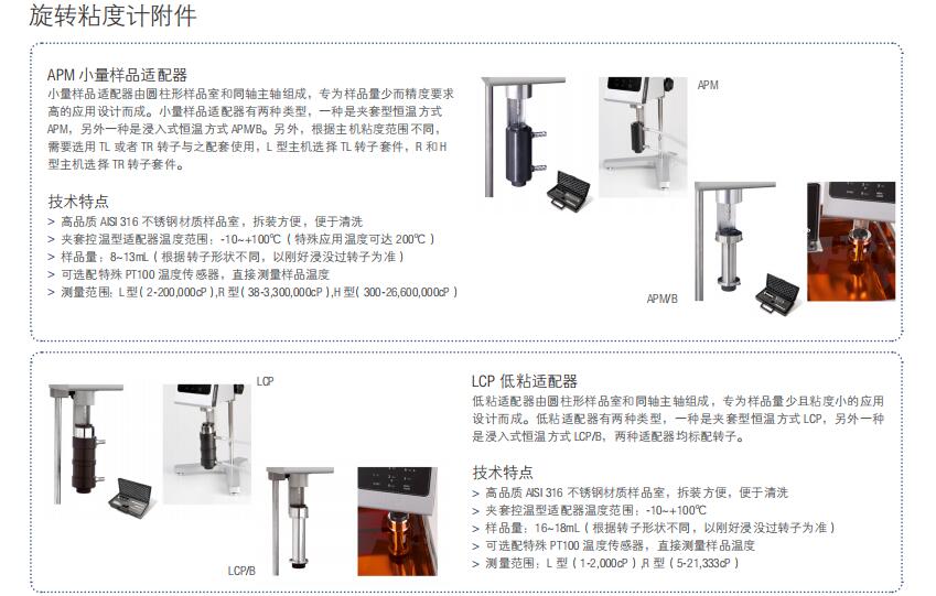 Smart標(biāo)準(zhǔn)型旋轉(zhuǎn)粘度計(jì)儀器選配件:標(biāo)準(zhǔn)粘度油、附加轉(zhuǎn)子、恒溫水浴、APM小量樣品適配器、LCP超低粘度適配器